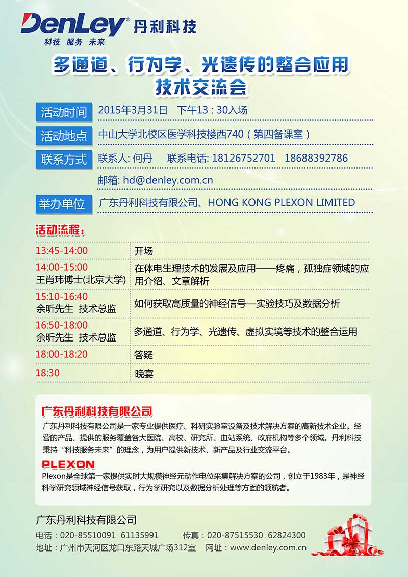 2015年3月31日下午13:30廣東丹利科技有限公司將在中山大學(xué)北校區醫學(xué)科技樓西740(第四備課室)舉辦多通道、行為學(xué)、光遺傳的整合應用技術(shù)交流會(huì )。