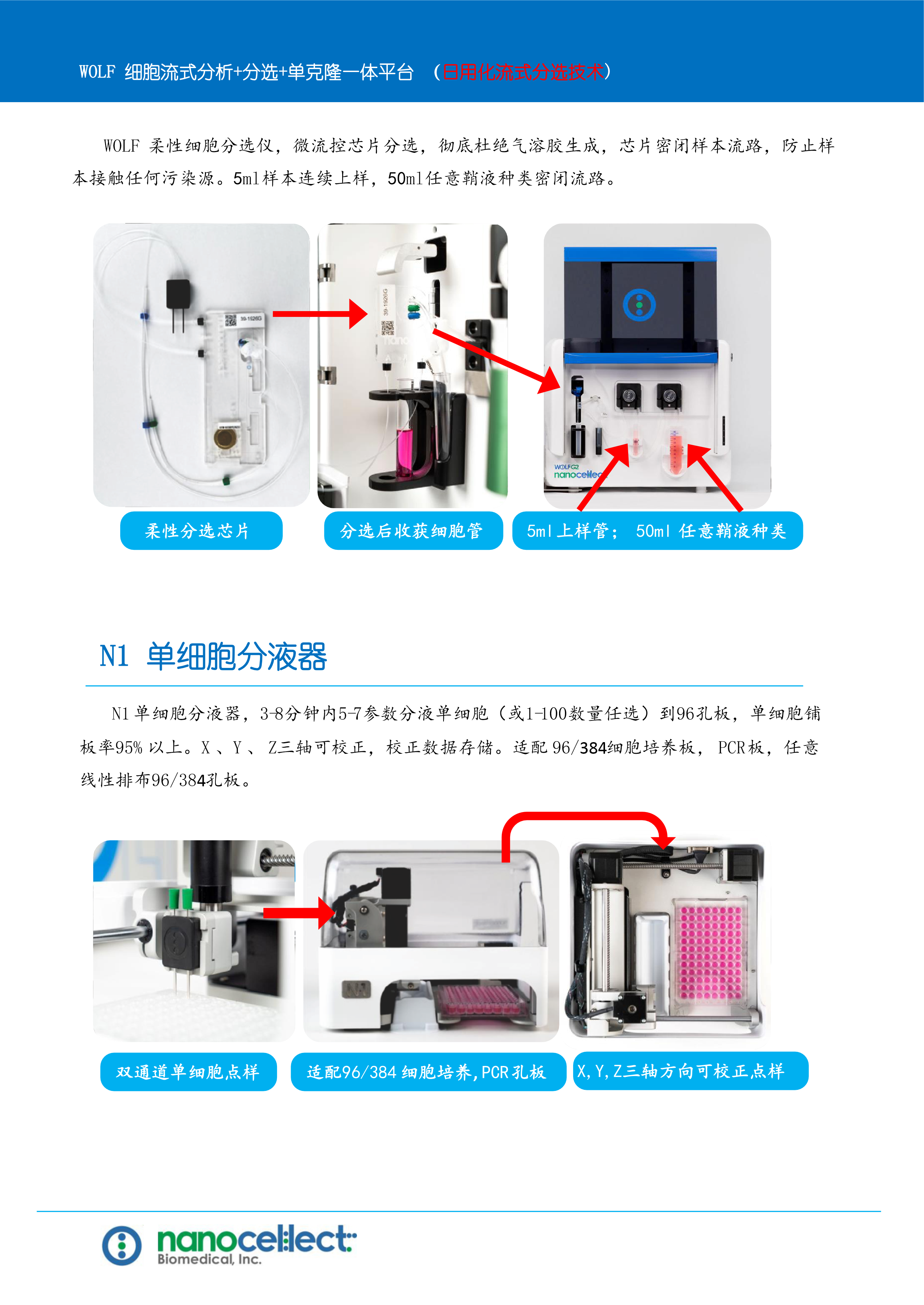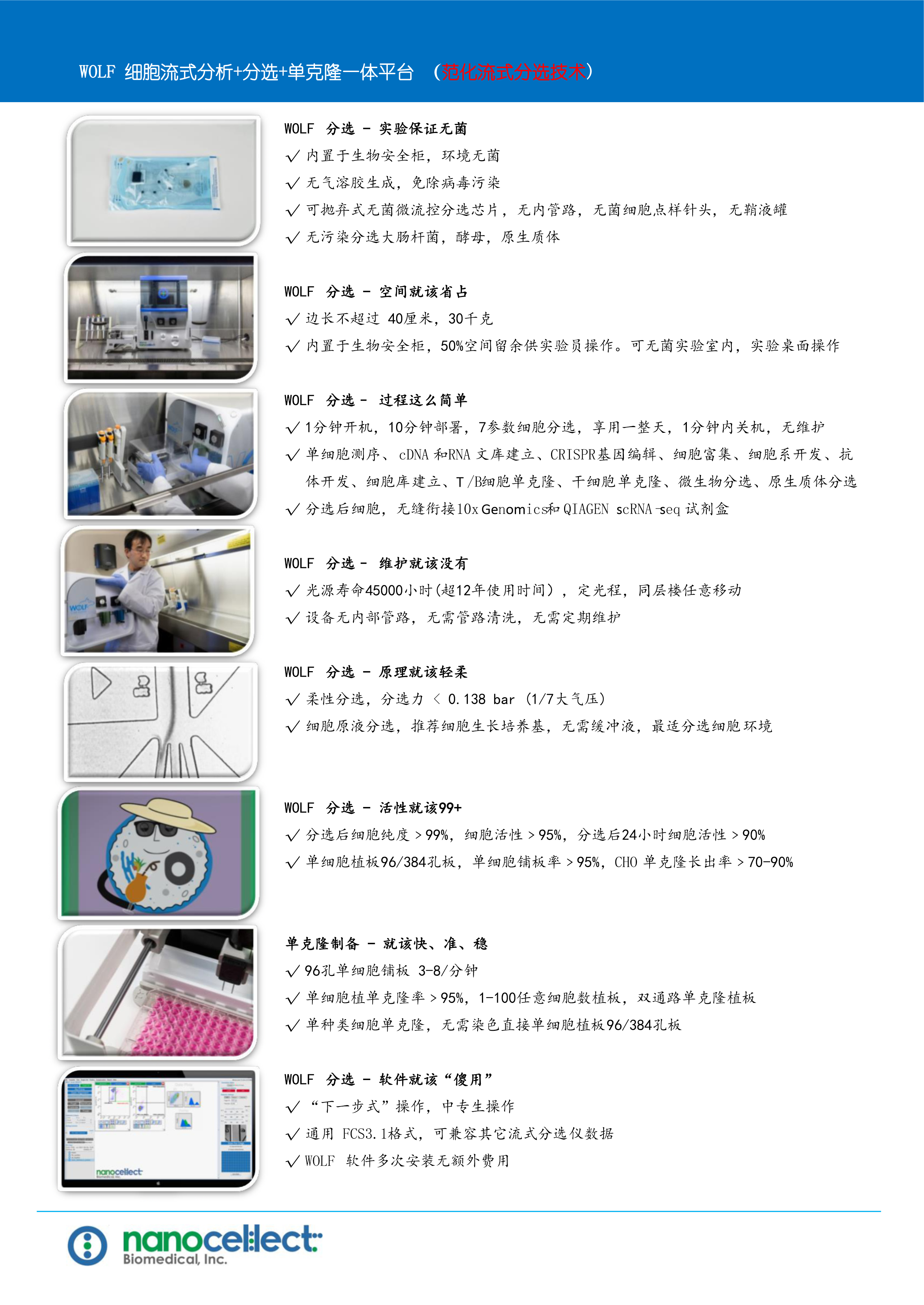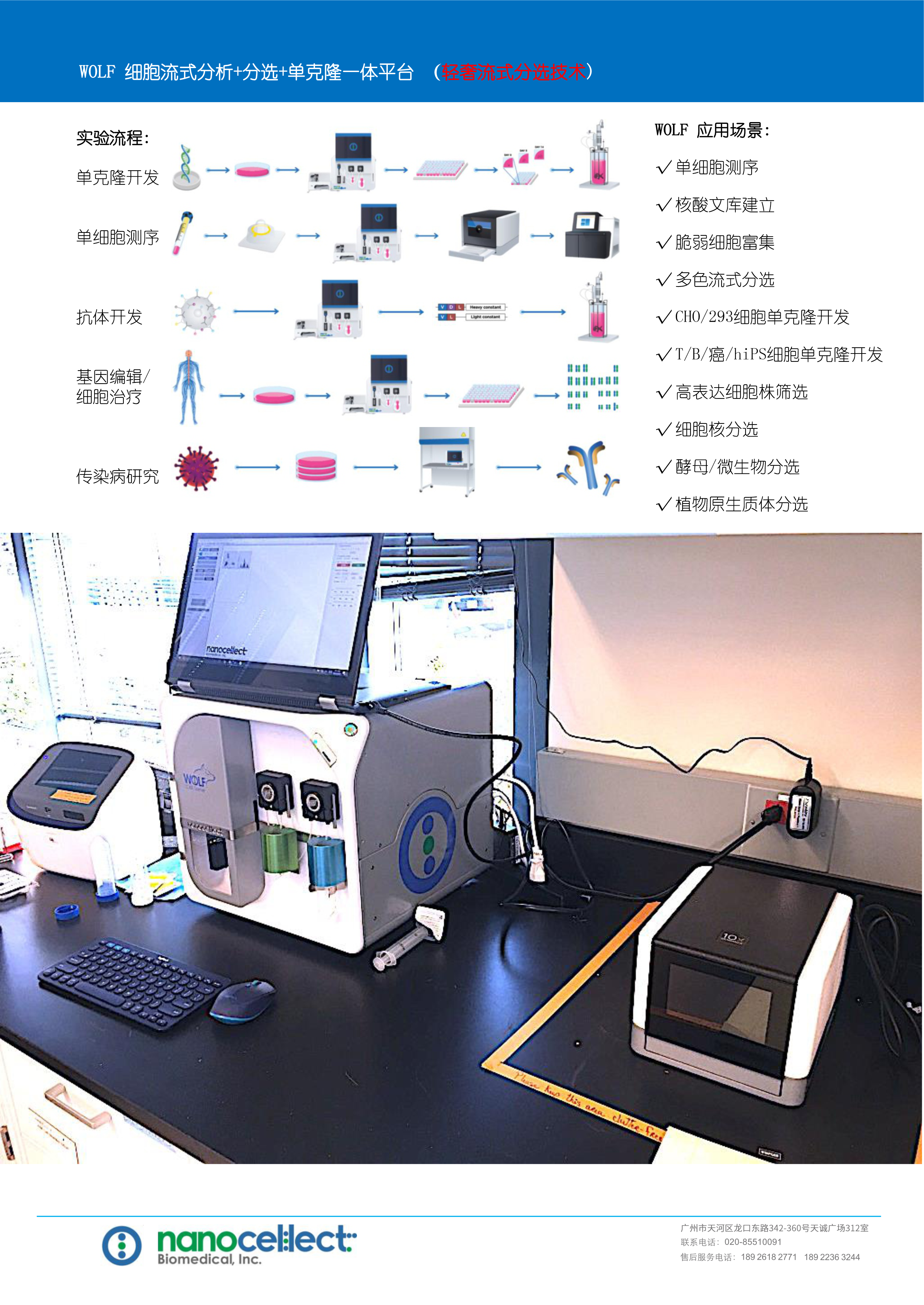 WOLF柔性細胞分選儀,微流控芯片分選,避免了氣溶膠生成,芯片密閉樣本流路,防止樣本接觸污染源。5ml樣本連續上樣,50ml鞘液種類(lèi)密閉流路。