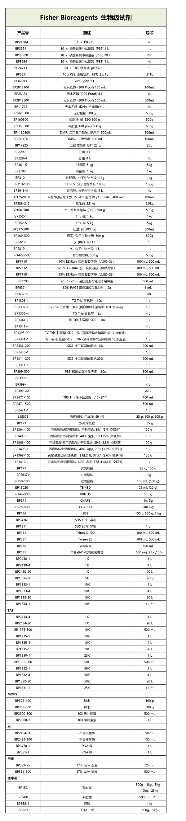 Fisher bioreagents原裝進(jìn)口試劑專(zhuān)注于生命科學(xué)領(lǐng)域,是生物化學(xué)高純試劑的先行者,一站式滿(mǎn)足您生命科學(xué)需求的高質(zhì)量、高純度和預認證試劑。部分熱銷(xiāo)產(chǎn)品: